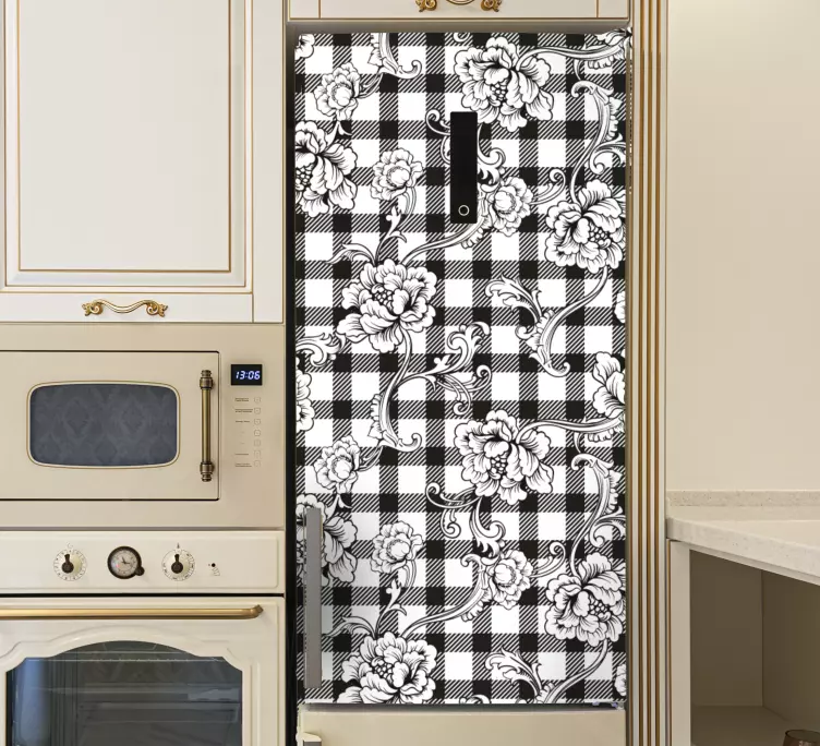 Descubre la elegancia de nuestro vinilo floral patrón de cuadros florales, un diseño cautivador que combina motivos florales con un elegante estampado a cuadros en blanco y negro. Este vinilo es perfecto para transformar la apariencia de tu refrigerador, nevera o frigorífico, aportando un toque de sofisticación y frescura a tu cocina. ¡Un detalle que no pasará desapercibido!