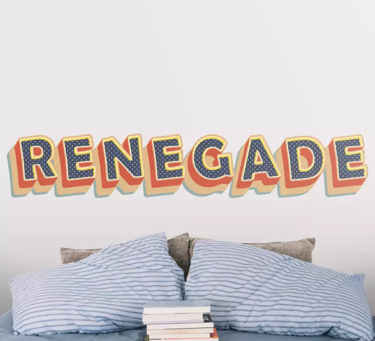 Referencia: A48092La cautivadora tipografía de 'Renegade' presenta una mezcla impactante de colores y formas, haciendo una declaración audaz. Este diseño llamativo añade personalidad y estilo a cualquier espacio, invitando a una sensación de individualidad y creatividad.