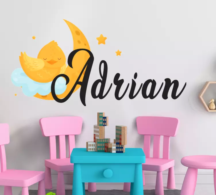 Descubre la magia del vinilo infantil diseño de luna linda, un hermoso diseño que presenta un adorable polluelo dormido bajo una luna sonriente, rodeado de suaves nubes y brillantes estrellas. Este producto personalizable permite añadir el nombre de tu pequeño, creando una ilustración única que transformará la habitación de los niños en un lugar encantador y acogedor. Es la opción perfecta para decorar el espacio de tu bebé, dándole un toque especial y lleno de ternura.