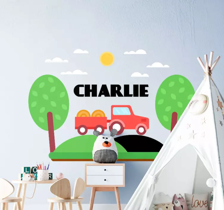 Descubre un mundo de diversión y creatividad con nuestro vinilo infantil escena de camiones personalizados, donde un vibrante tractor y alegre granja se combinan en un diseño lleno de vida. Este adorable vinilo está pensado para encantar a los niños, presentando camiones juguete que recorren un paisaje verde salpicado de árboles, todo bajo un brillante sol. Además, puedes personalizarlo para que se adapte perfectamente a la habitación de tus pequeños aventureros.