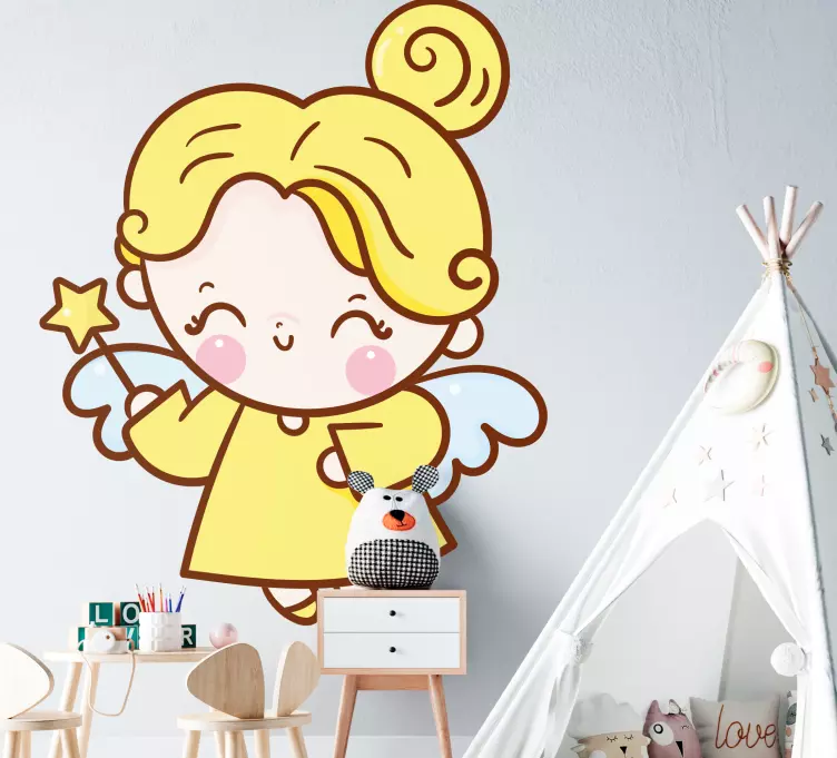 Descubre la magia de la decoración infantil con nuestro vinilo infantil personaje de Ángel lindo, donde un ángel juguetón y sonriente sostiene su varita mágica en un vibrante amarillo. Este adorable hada combina un diseño caprichoso y amigable que encantará a los más pequeños, creando un ambiente lleno de alegría y fantasía en su habitación.