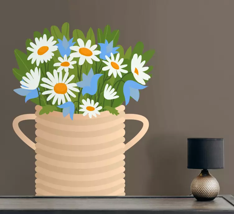 Descubre la belleza de la naturaleza en tu hogar con nuestro Vinilo jarrón de arreglo floral. Este encantador diseño presenta un jarrón lleno de vibrantes flores, incluyendo hermosas margaritas, pétalos azules y hojas verdes que evocan la frescura y el colorido del entorno natural. Cada elemento está cuidadosamente diseñado para aportar un toque de alegría y frescura a cualquier espacio.