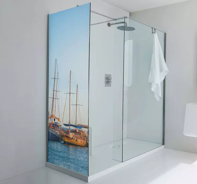 Descubre el encanto del vinilo mampara ducha escena de barcos a vela, un diseño que evoca la tranquilidad del mar. Este vinilo presenta una hermosa representación de barcos navegando en un puerto, rodeados por un muelle que invita a la aventura. La fotografía captura la esencia marítima, donde marineros y el agua se combinan en una escena exterior perfecta para aquellos que aman la navegación y la vida náutica.