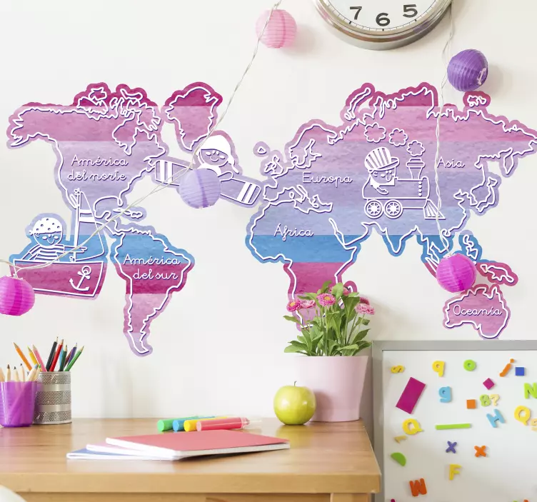 Descubre la magia del mundo con nuestro Vinilo mapa mundial aventura, un diseño que cautiva con su estilo de acuarela y contornos juguetones. Perfecto para el cuarto de los niños, este mapa es no solo un elemento decorativo, sino también una herramienta educativa que despierta la curiosidad por la geografía. Su estética vistosa transforma cualquier espacio en un lugar de exploración e imaginación.