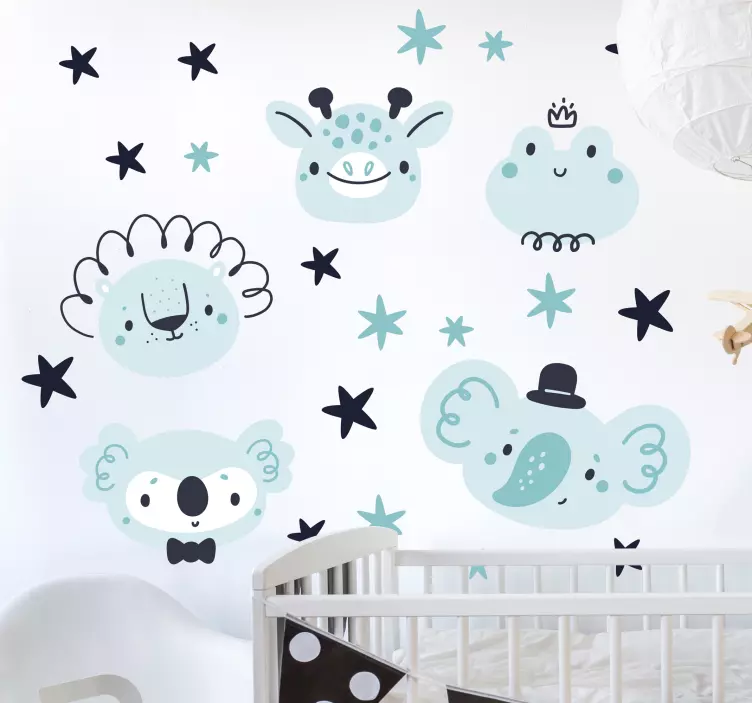 Descubre el encantador vinilo mascota caras de animales adorables, una pieza decorativa que combina un diseño nórdico y lindo con dibujo animado de adorables animales en tonos azules. Este vinilo, ideal para habitaciones de niños, añade un toque juguetón y vistoso a cualquier espacio, complementado con motivos de estrellas que invitan a soñar. ¡Es perfecto para transformar la decoración de tu hogar en un lugar mágico y divertido!