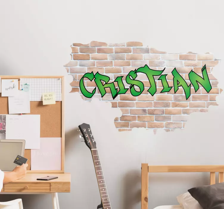 Transforma tus espacios con nuestro vinilo mural urbano personalizado, que presenta un diseño vibrante y contemporáneo. Imagina una pared de ladrillo que cobra vida con tu nombre personalizado en un estilo de graffiti auténtico, lleno de energía y color. Este arte urbano se adapta a tu personalidad, permitiéndote crear un ambiente único y fresco en cualquier habitación. La tonalidad verde resalta entre los ladrillos, brindando un toque moderno y divertido que cautivará a todos.