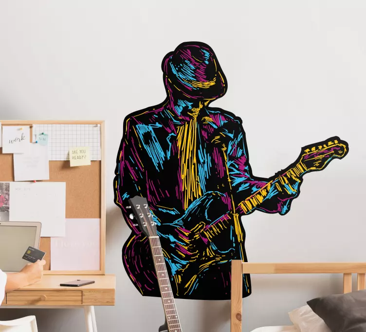 Referencia: A48543Una silueta vibrante que representa a un guitarrista vestido con un traje elegante y un sombrero, capturado en pleno rendimiento. La representación artística utiliza colores audaces para resaltar la energía de la música, convirtiéndola en una adición perfecta para los entusiastas de la música.