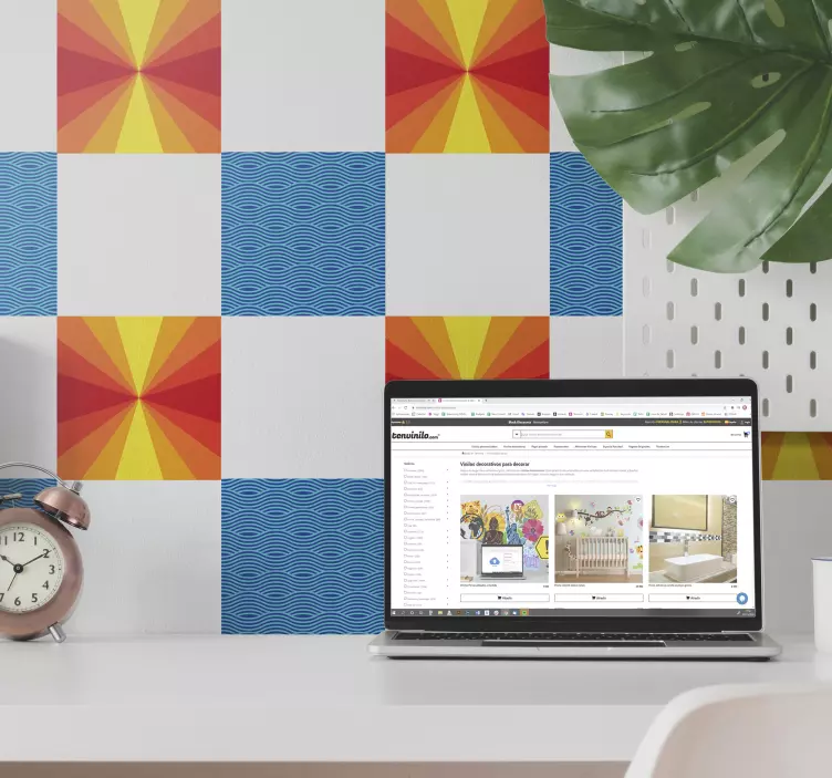 El vinilo ornamental composiciones geométricas vibrantes es una obra de arte visual que transforma tus espacios. Con un diseño cuadrado que evoca una cuadrícula dinámica, captura la esencia de un atardecer lleno de ondas y patrones geométricos vibrantes. Este estampado moderno y vistoso aporta un toque abstracto que revitaliza cualquier entorno, llenándolo de energía y color.