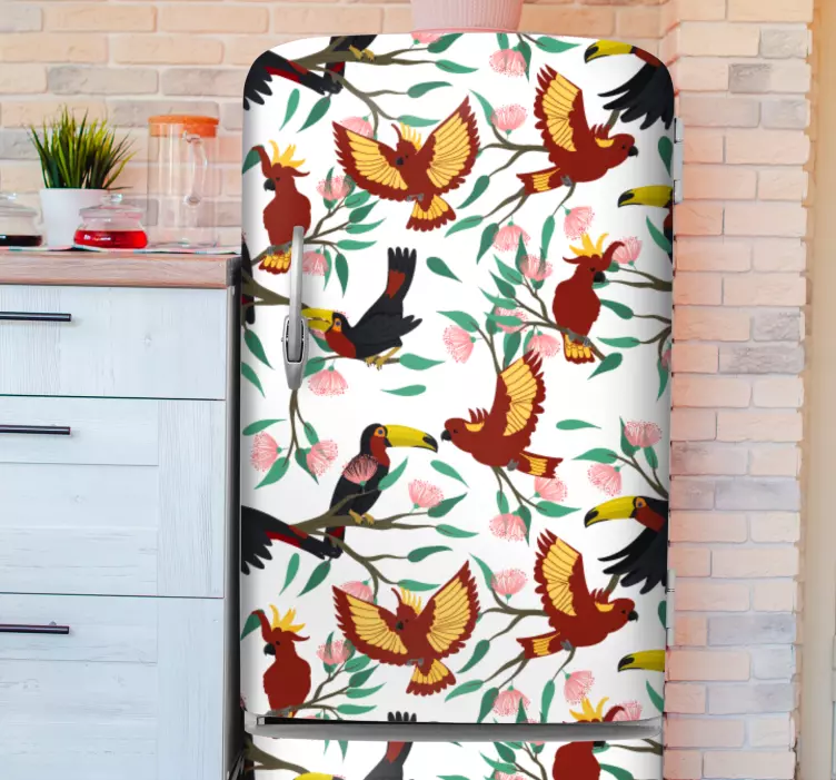 Transforma tu espacio con el vinilo pájaro motivos de aves tropicales, un diseño vibrante que captura la esencia de la naturaleza tropical. Este estampado caprichoso incluye loros y tucanes rodeados de un hermoso patrón floral, perfecto para adornar cualquier refrigerador, nevera, frigorífico o heladera. Su diseño vistoso no solo alegra el entorno, sino que también invita a la diversión y a la alegría en tu hogar.