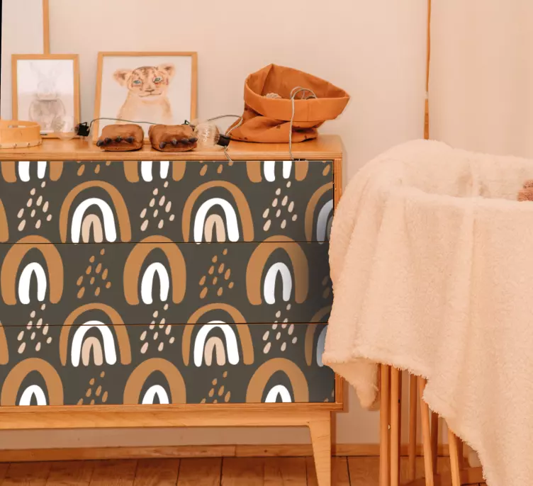 Transforma tus muebles con el Vinilo para mueble arcos coloridos, un diseño vibrante que se destaca con un hermoso arcoiris y gotas de lluvia. Este patrón estampado es geométrico, texturizado, vistoso y moderno, aportando un toque juguetón a cualquier mueble. Ideal para quienes buscan añadir un elemento dinámico y alegre a su decoración, este vinilo es perfecto para revivir sus espacios.