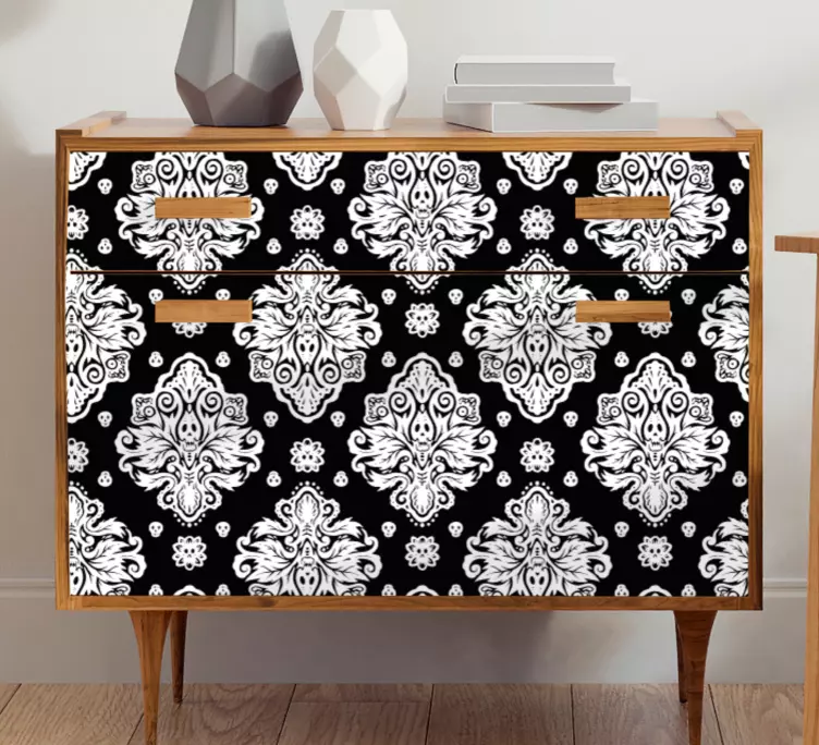 Descubre el vinilo para mueble con diseño elegante y patrones, una opción perfecta para transformar tus muebles y darles un toque único y moderno. Este diseño presenta calaveras y motivos florales, con un hermoso patrón damasco en blanco y negro. Su patrón ornamentado y estilo moderno lo convierten en un elemento ideal para el interior de la casa, aportando frescura y originalidad a cualquier espacio.