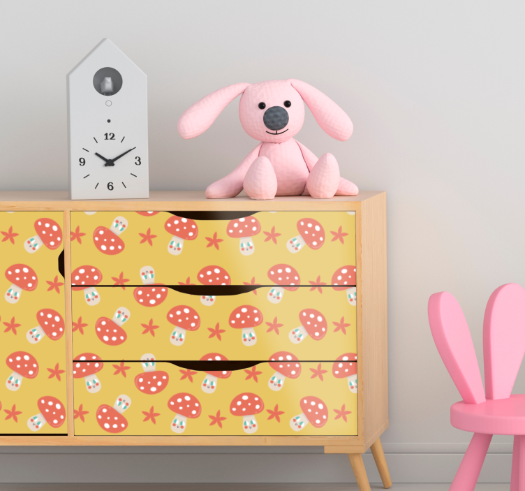 Descubre la magia del Vinilo para mueble diseño de patrones de hongos, donde la emblemática Amanita muscaria se entrelaza con estrellas en un fondo amarillo vibrante. Este diseño caprichoso y juguetón es perfecto para darle un toque especial a tus muebles, especialmente en la decoración infantil. ¡Transforma cualquier espacio en un mundo de fantasía con setas y colores que inspiran alegría!