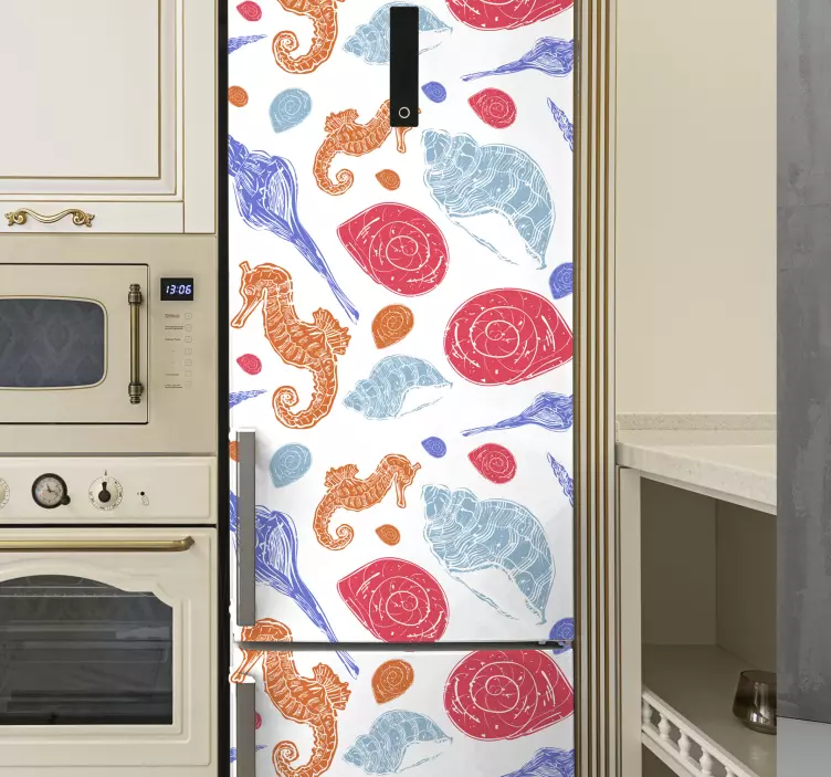 Transforma tu frigorífico en una obra de arte marina con nuestro Vinilo para nevera caballito de mar y conchas, un diseño vibrante que captura la esencia del mar y la vida marina. Con hermosos caballitos de mar, conchas marinas y un patrón acuático, este vinilo es la manera perfecta de añadir un toque juguetón y marino a tu refrigerador. Su estampado vistoso lo convierte en una opción ideal para quienes desean darle un aire marinero y marítimo a su cocina.