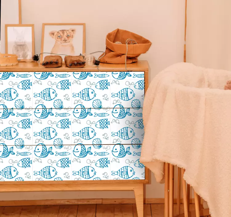 Transforma la habitación de los niños con nuestro Vinilo para nevera motivos de peces divertidos, un diseño lleno de color y alegría. Este gráfico encantador presenta un patrón vibrante de peces caprichosos nadando en un océano de vida marina, complementado con burbujas y conchas. Es un mueble decorativo que añade un toque divertido y vistoso, ideal para hacer que cualquier cajón o mueble se sienta más acogedor y alegre.