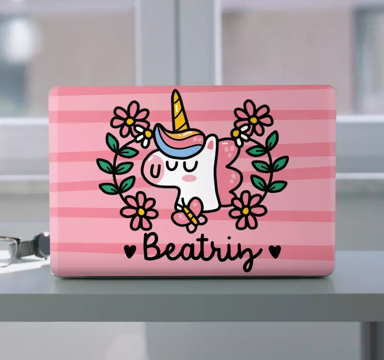 Descubre el vinilo para portátil diseño floral de unicornio, una pieza encantadora que transforma tu ordenador portátil en una obra de arte. Con un diseño lindo y vistoso, este vinilo combina tonos de rosa y rosado con adorables flores y un caprichoso unicornio, todo en un fondo de rayas. Además, puedes personalizarlo con tu nombre o un dibujo a tu gusto, lo que lo convierte en una opción personalizable que seguramente hará brillar tu estilo!