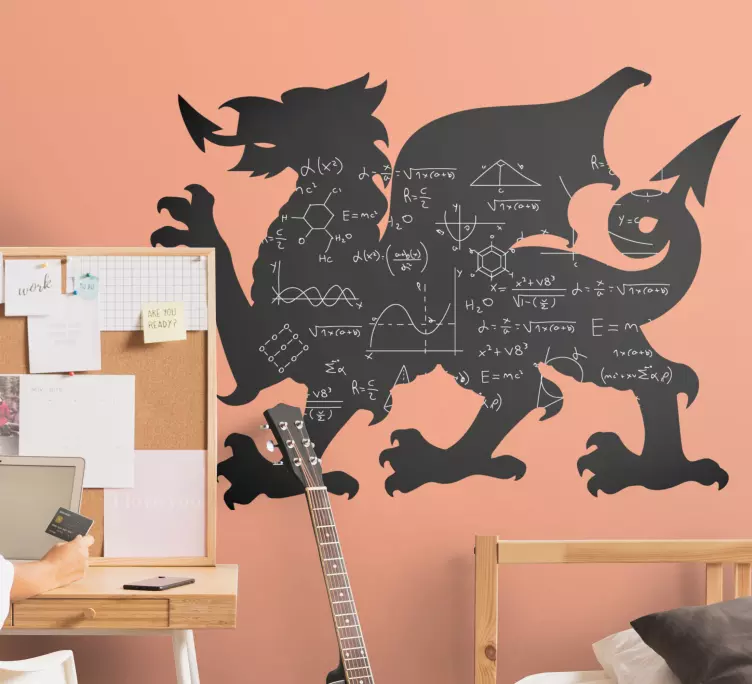 Descubre el vinilo pizarra silueta de dragón galés, una pieza única que combina un diseño gráfico estilizado con un emblema galés. Su silueta geométrica evoca la rica cultura de Gales, ofreciendo una forma divertida y educativa de interactuar con las matemáticas. Este adhesivo es perfecto para quienes buscan un toque moderno en la decoración de sus espacios, transformando cualquier pared en un símbolo de creatividad.