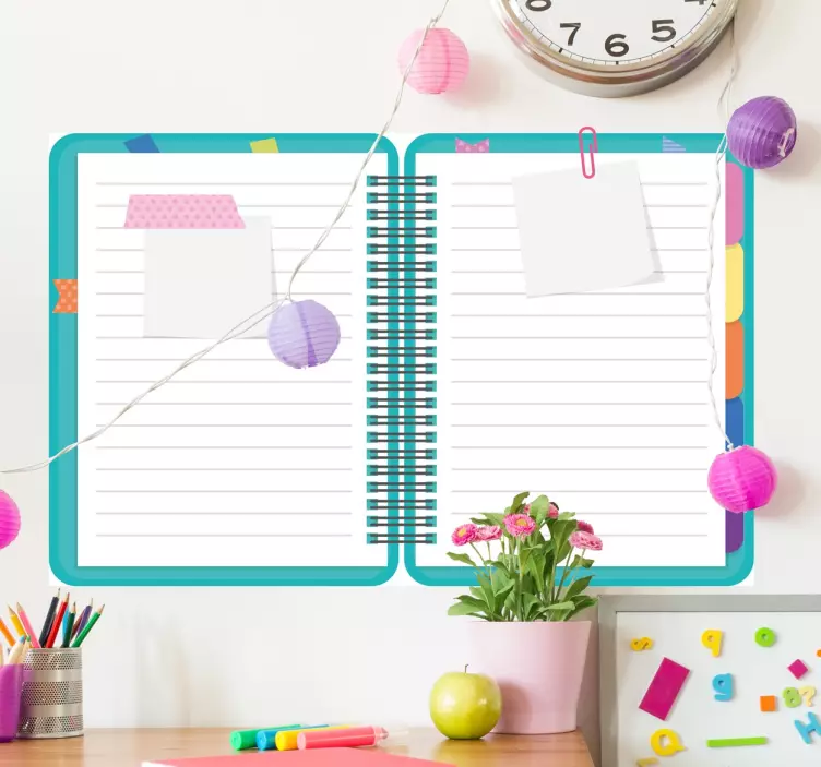 Vinilos vileda para habitaciones juveniles e infantiles con un colorido dibujo de una libreta. Regálales a tus hijos un práctico vinilo decorativo dónde podrán anotar su lista de tareas, ideas, hacer dibujos o recordatorios. Este tipo de sticker debe ir aplicado sobre superficie totalmente lisa.