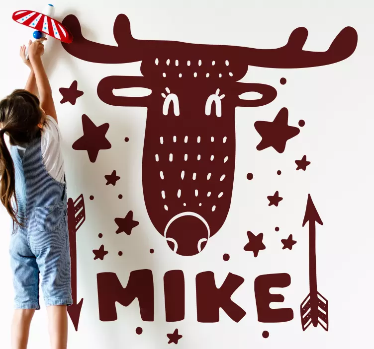 Referencia: A47846Una encantadora representación de la cara de un ciervo adornada con estrellas y flechas juguetonas, creando una atmósfera divertida perfecta para espacios infantiles. Esta pieza personalizable permite agregar toques personales, convirtiéndola en un añadido único para cualquier habitación.