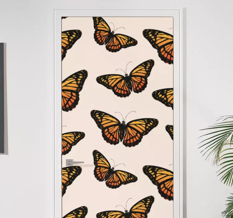 Transforma tu espacio con nuestro vinilo puerta ilustración de mariposas coloridas. Este adhesivo presenta un diseño gráfico vibrante que captura la esencia de la naturaleza a través de un bello patrón de mariposas monarca en tonalidades naranjas. Ideal para dar un toque decorativo a cualquier puerta, este estampado resalta la belleza de cada mariposa en un entorno que invita a la alegría y la creatividad.