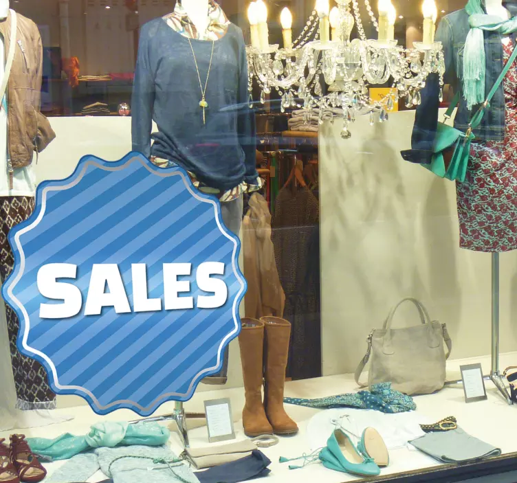Descubre nuestro vinilo rebajas insignia de ventas promocionales, un adhesivo diseñado con un atractivo gráfico que incluye rayas en un vibrante color azul. Este diseño no solo destaca las rebajas y ofertas de tu tienda, sino que también es personalizable para adaptarse a tus necesidades. Ideal para minoristas que buscan captar la atención de sus clientes con un estilo fresco y profesional.