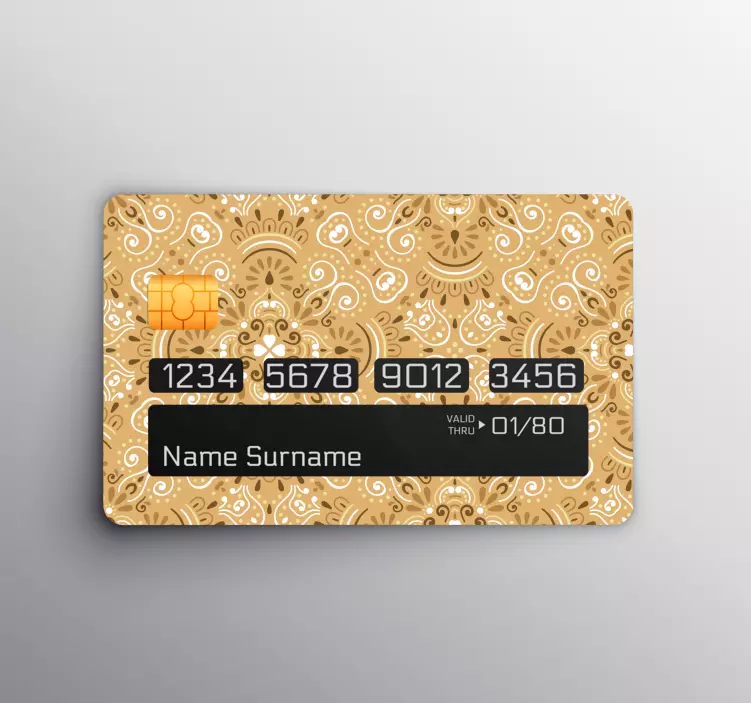 El vinilo tarjeta de crédito patrón ornamental presenta un diseño gráfico espectacular en tonos beige, con un patrón ornamental y florido. Este estampado elegante transforma cualquier tarjeta de crédito en una pieza de arte decorativo. Su diseño decorativo no solo embellece, sino que también ofrece una forma única de personalizar tus tarjetas, haciéndolas destacar en cualquier situación.